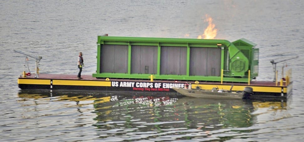 Hydro Dam Reservoir Waterborne Debris Elimination by multiple S327 Air Curtain Burners