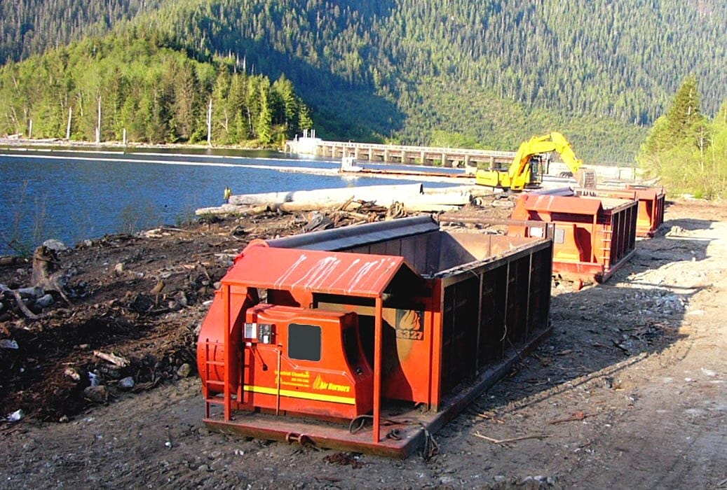 For disaster recovery cleanup at canals with commercial shipping lanes, FireBoxes are employed on the canal banks and dragged from debris pile to debris pile as far as the shoreline allows. Again, wet debris can be accommodated.